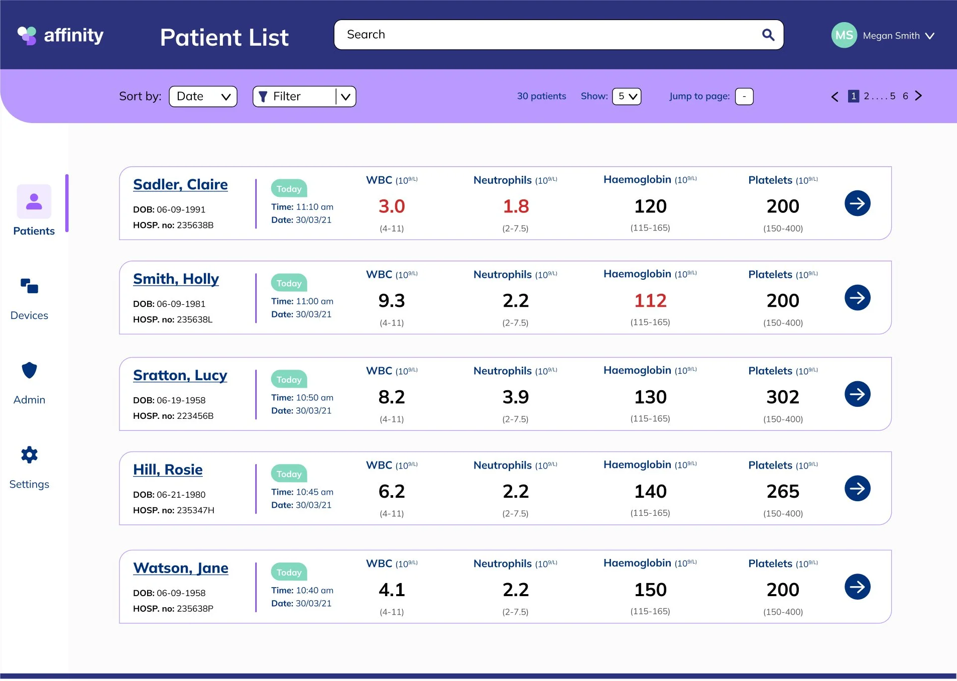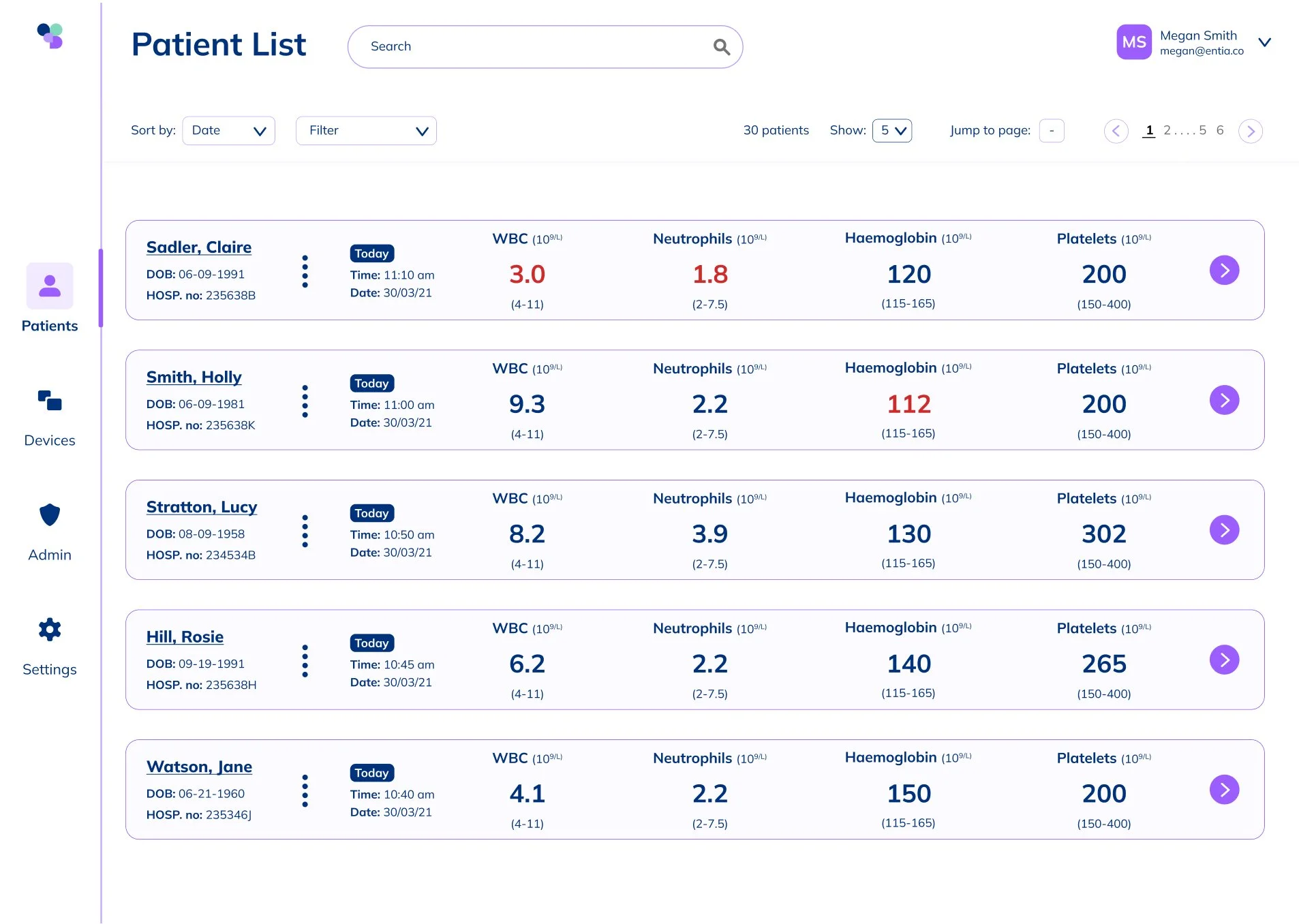 We learned from research that hospitals have a standardized range for healthy blood test results, so we implemented a color warning for out-of-range results and a chip that communicated how long ago the result was taken, as results were only relevant for 48 hours.